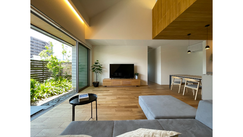 板塀に囲まれたプライベートな庭からつながる開放的なLDKと、のびやかな吹き抜け空間が家族の時をつなげてくれる住宅です。ペット共生や家事動線など、お住まいのヒントがたくさん詰まった分譲住宅を是非ご見学にお越しください。